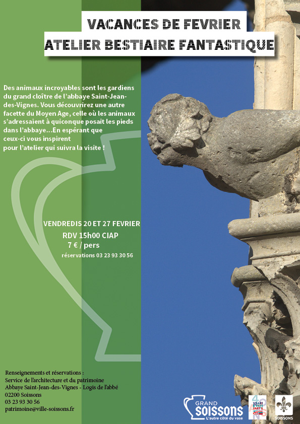 Des animaux incroyables sont les gardiens du grand cloître de l'abbaye Saint-Jean-des-Vignes de Soissons. Vous découvrirez une autre facette du Moyen Age, celle où les animaux s'adressaient à quiconque posait les pieds dans l'abbaye...En espérant que ceux-ci vous inspirent pour l'atelier qui suivra la visite !