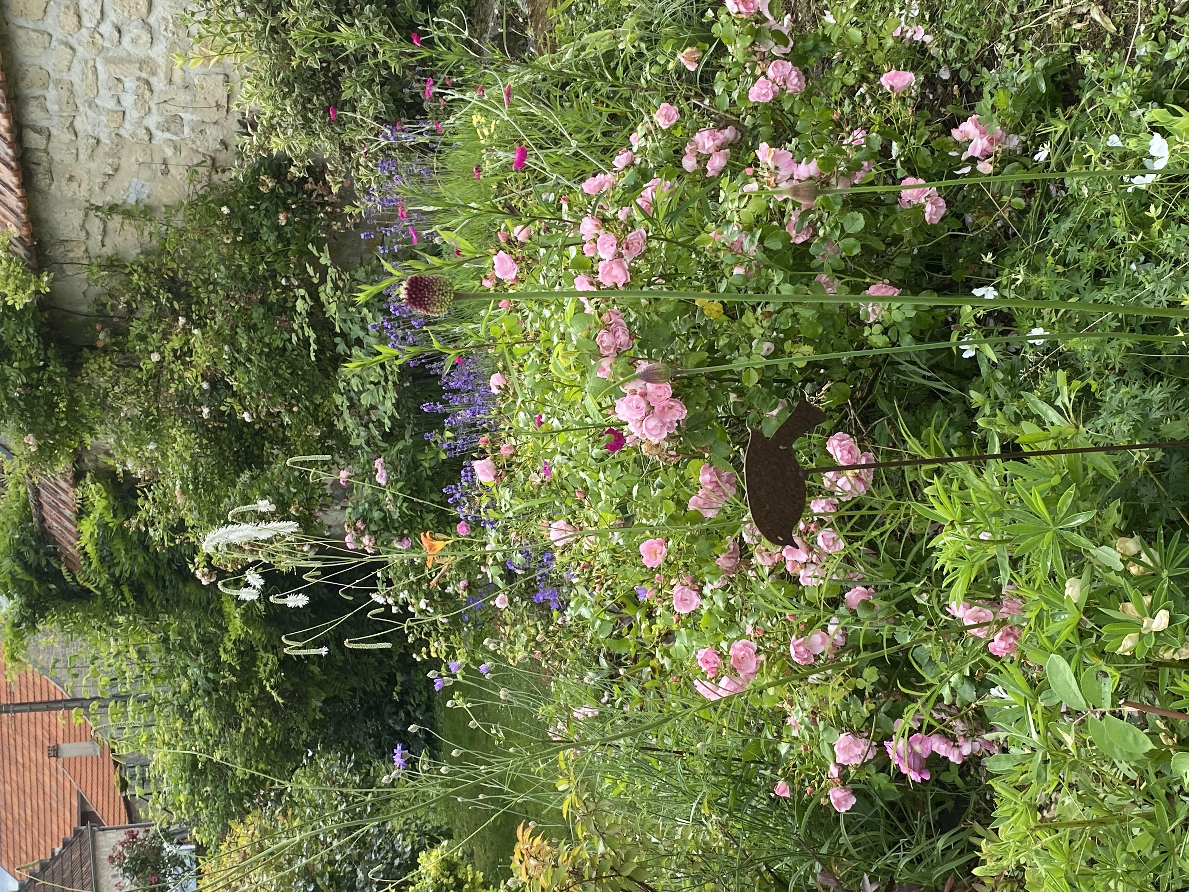 Pour la première fois, nous ouvrons notre jardin. Conçu sur les ruines d'un ancien couvent, dont subsistent quelques murs, murets et escaliers, notre jardin est d'inspiration anglaise et romantique. Roses, arbustes, vivaces peuplent les coins de soleil et d'ombre. Un lieu chargé d'histoire où il fait bon déambuler...