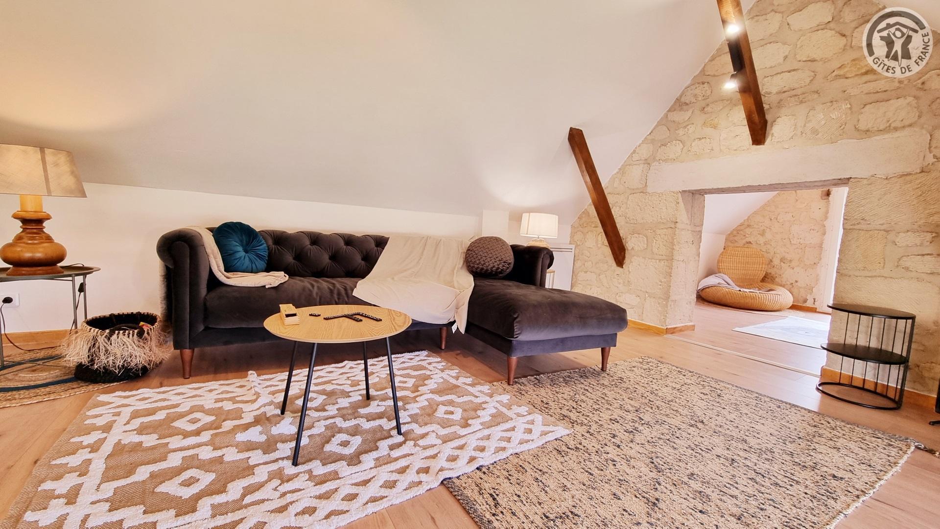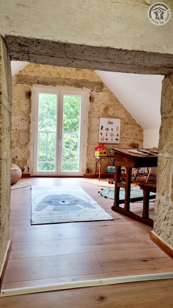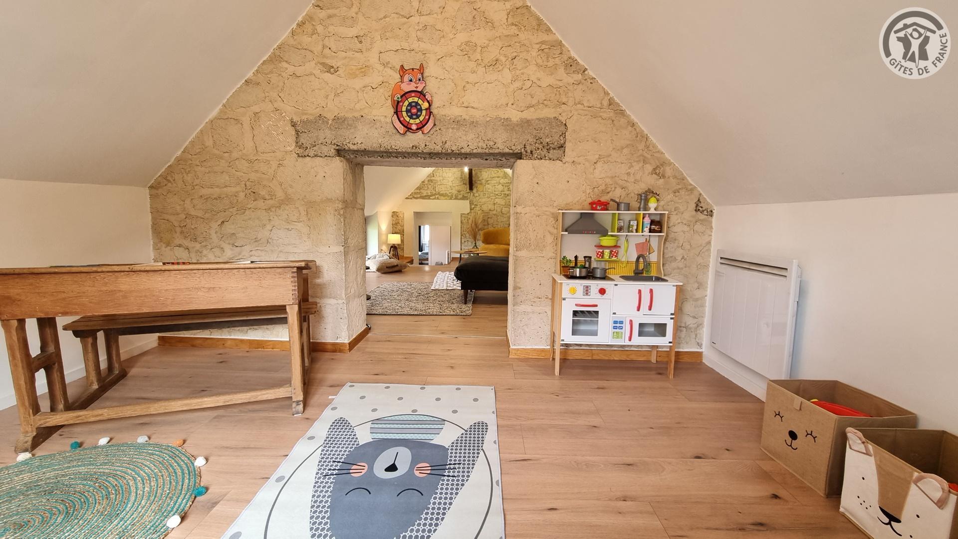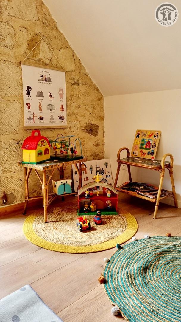 Maison indépendante située à 100 mètres du centre du village. Accès par un escalier extérieur. Sur le même niveau, vous trouverez une cuisine équipée (four, 4 plaques vitrocéramiques, réfrigérateur avec partie congélateur et micro-ondes, lave-linge), avec espace repas. WC indépendant. Une chambre aménagée avec un lit 140x190cm. Une seconde chambre aménagée avec 2 lits 90x190cm. Une salle d'eau avec douche à l'italienne 1.90x1m, lave-linge, une vasque. Accès par quelques marches à un espace salon avec canapé et TV 80cm, ainsi qu'un accès à une salle de jeux pour enfants (hauteur de passage 1.50m). Cour fermée privative de 250 m² et parking privatif pour plusieurs véhicules sécurisé avec un portail manuel. Salon de jardin, plancha électrique. Gîte en TOUT INCLUS (charges énergétiques, draps, linge de toilette et ménage fin de séjour). Hébergement sans internet.