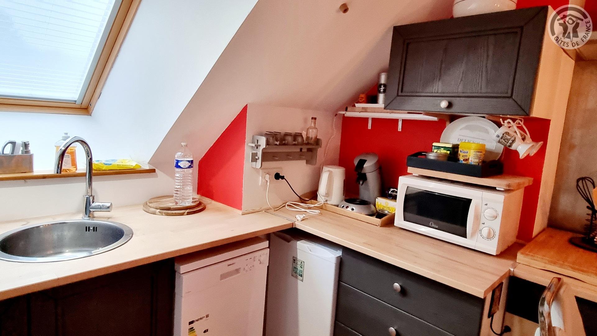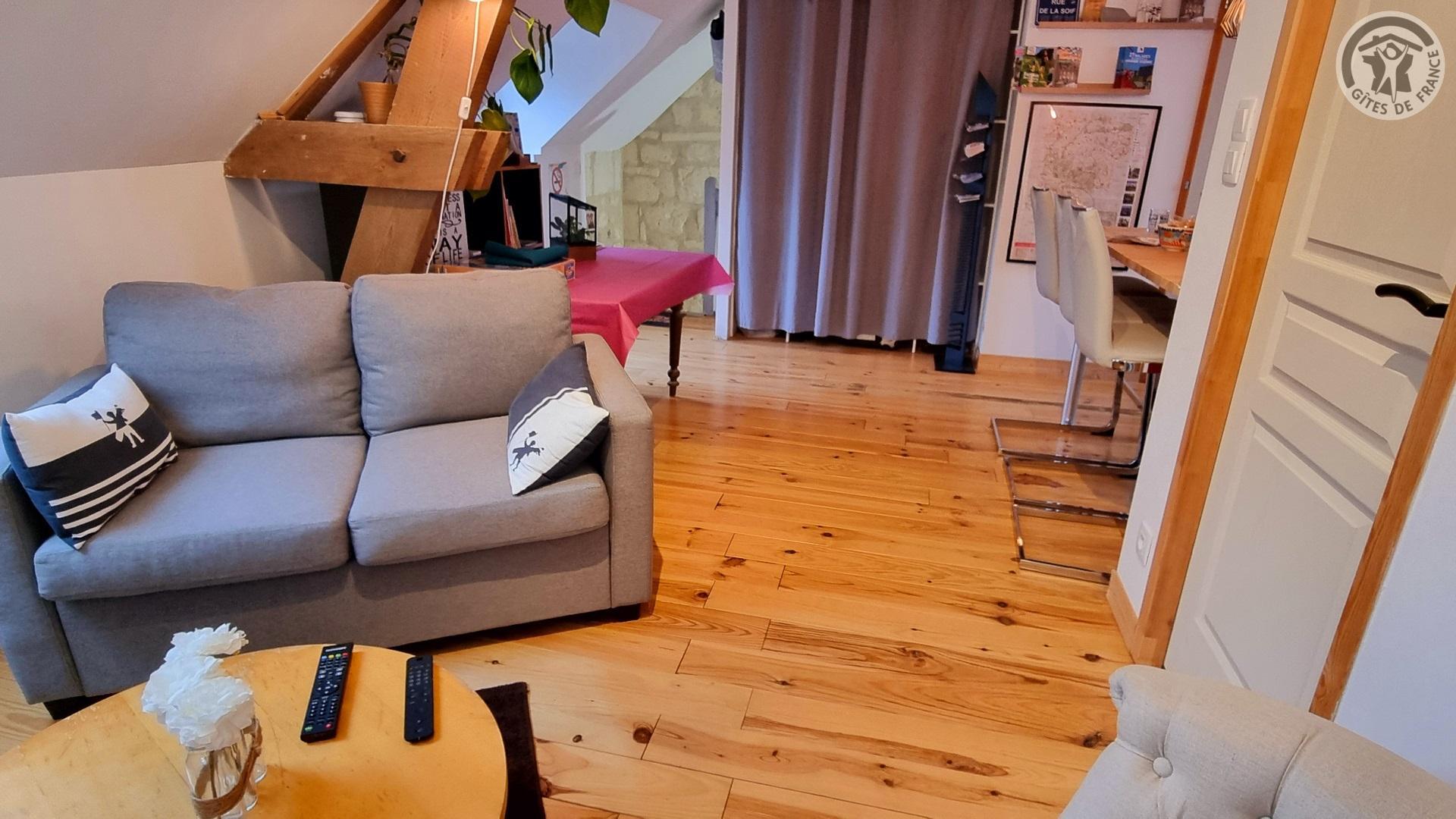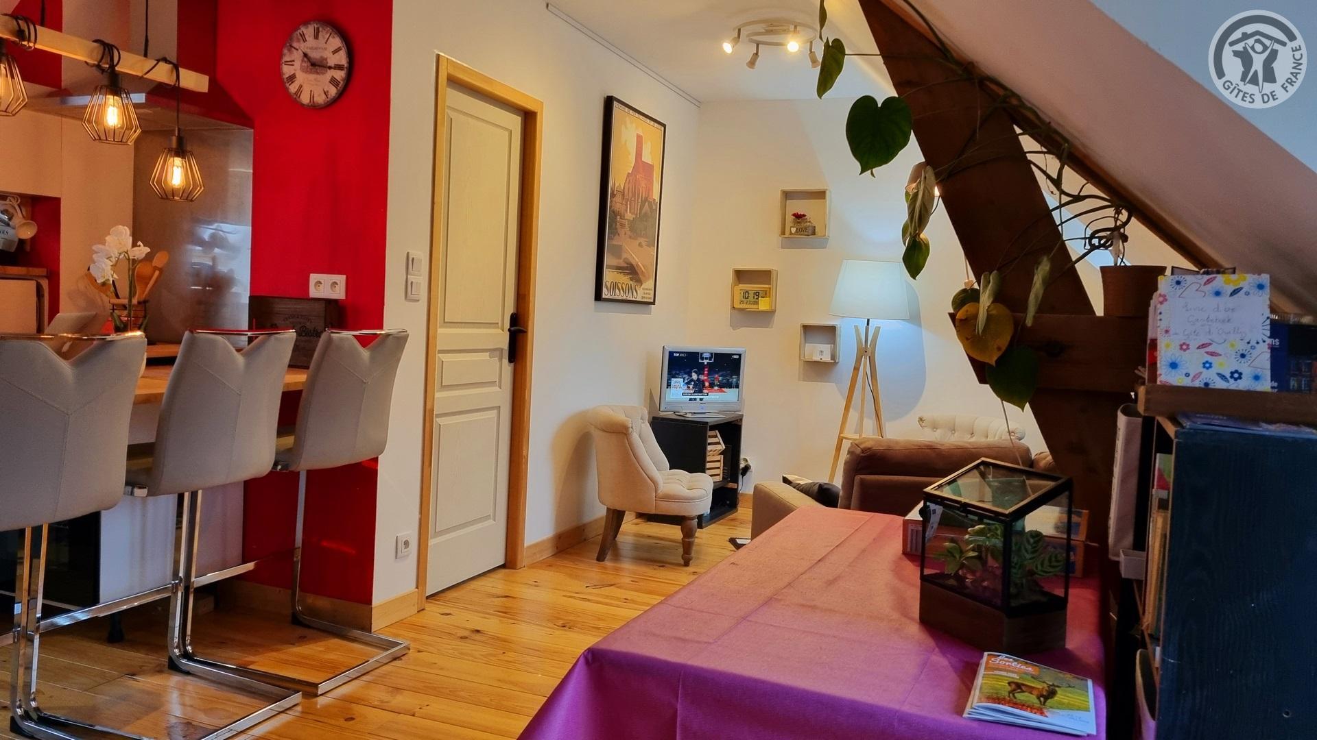Gîte studio de 23,5 m² à l'étage d'une dépendance mitoyenne à l'habitation des propriétaires, situé à 1 km du centre du village. Parking privatif sur la propriété, chemin d'accès non goudronné. Pièce de vie avec coin cuisine équipé (plaque à induction 3 foyers, lave-vaisselle, four, frigo table-top avec freezer, four micro-ondes, hotte aspirante, table bar avec tabourets) ouvert sur salon avec un canapé, 2 fauteuils et TV 60 cm, un bureau et une chaise. Wifi (débit fibre). Chambrette de 5 m² (loi Carrez) avec un lit en 140x190cm. Salle d'eau de 3 m² avec cabine de douche en 80x80cm, une vasque, un WC et un lave-linge. Terrasse de 10 m² privative et jardin de 500 m² commun au propriétaire, avec SPA extérieur (disponible de début avril à fin octobre, 10€/heure/personne). Barbecue au charbon ou plancha au gaz à disposition. Gîte en tout inclus (draps, linge de toilette, ménage de fin de séjour et charges énergétiques compris dans le prix de location).