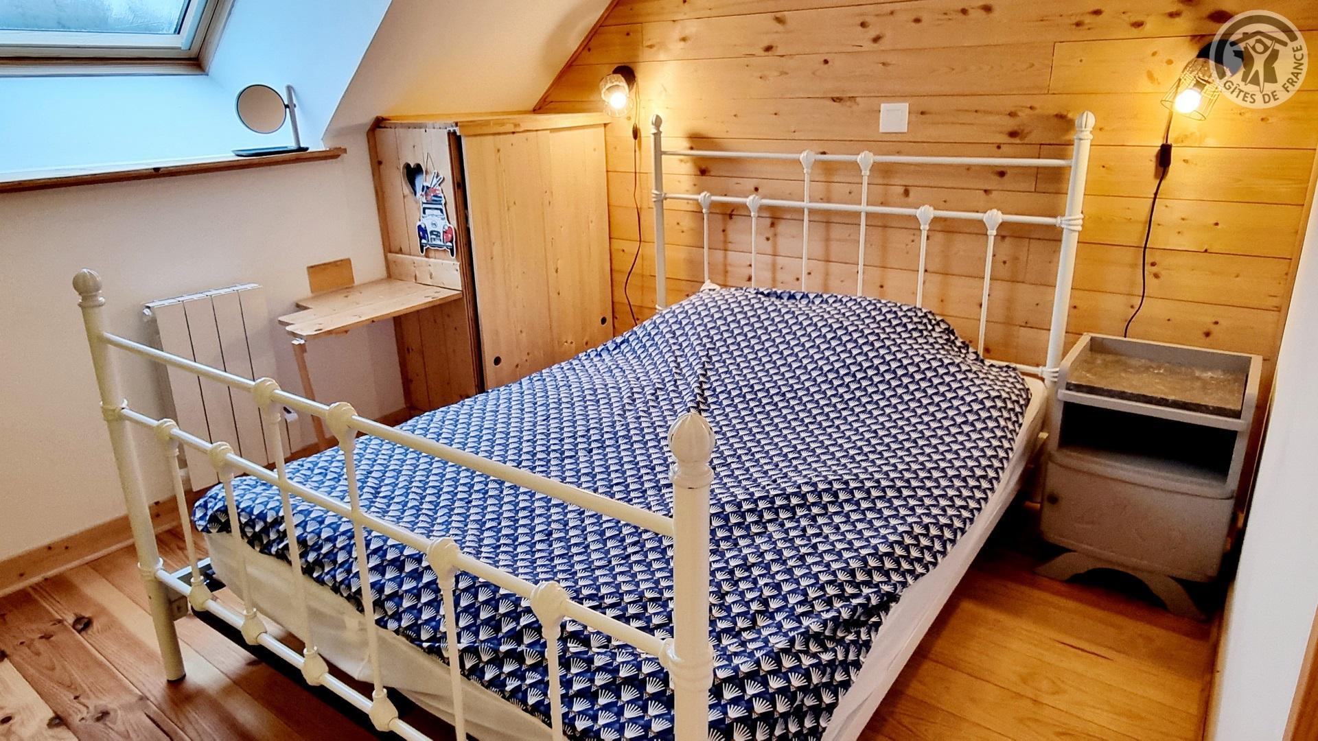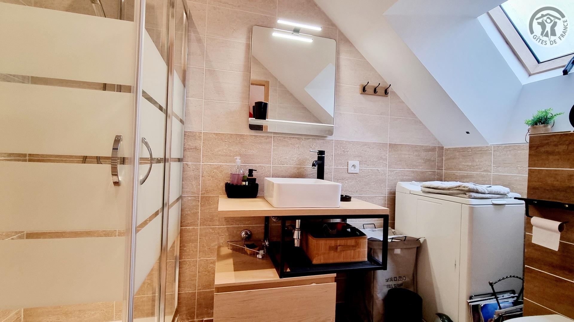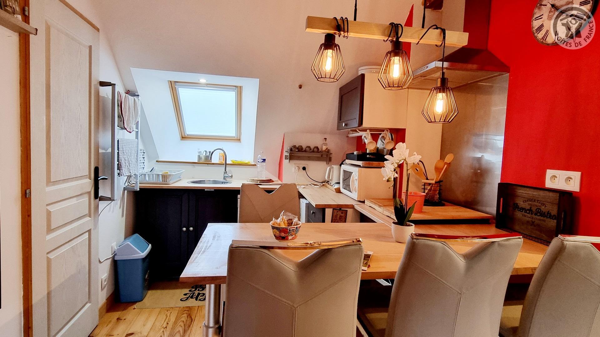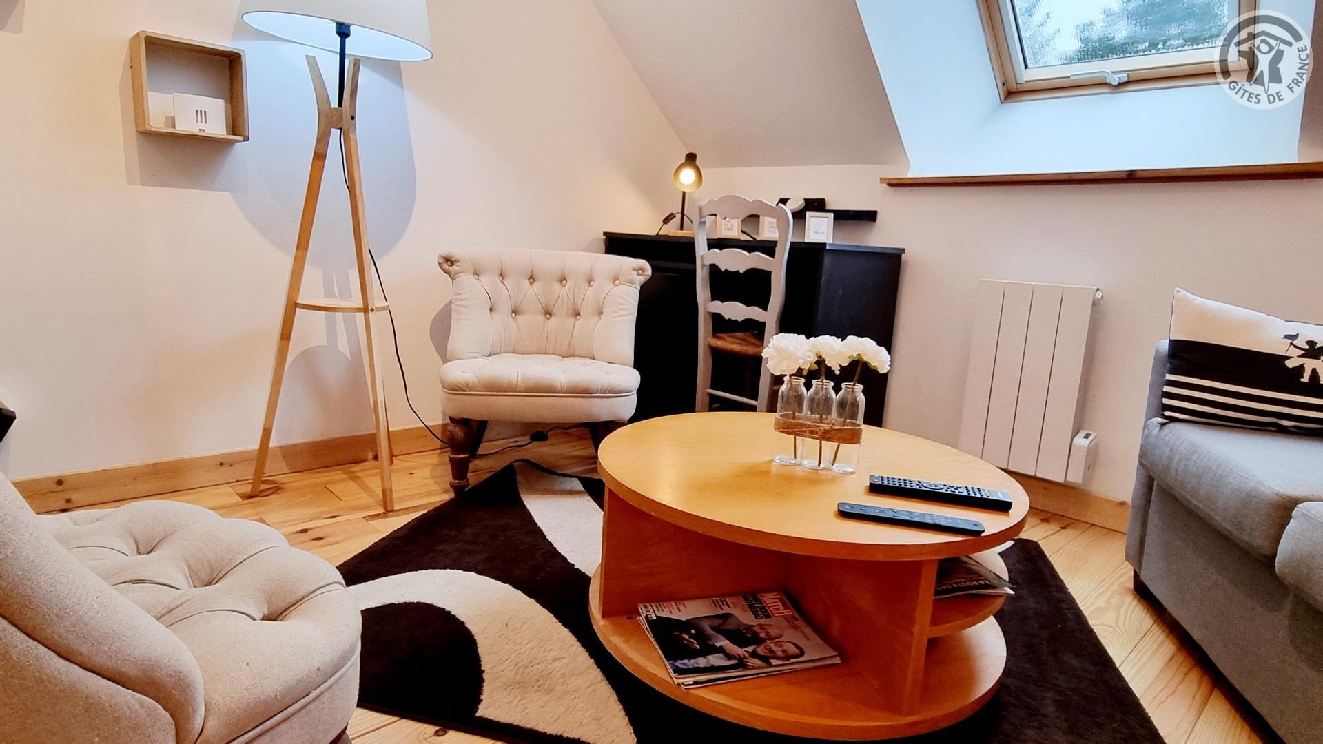 Gîte studio de 23,5 m² à l'étage d'une dépendance mitoyenne à l'habitation des propriétaires, situé à 1 km du centre du village. Parking privatif sur la propriété, chemin d'accès non goudronné. Pièce de vie avec coin cuisine équipé (plaque à induction 3 foyers, lave-vaisselle, four, frigo table-top avec freezer, four micro-ondes, hotte aspirante, table bar avec tabourets) ouvert sur salon avec un canapé, 2 fauteuils et TV 60 cm, un bureau et une chaise. Wifi (débit fibre). Chambrette de 5 m² (loi Carrez) avec un lit en 140x190cm. Salle d'eau de 3 m² avec cabine de douche en 80x80cm, une vasque, un WC et un lave-linge. Terrasse de 10 m² privative et jardin de 500 m² commun au propriétaire, avec SPA extérieur (disponible de début avril à fin octobre, 10€/heure/personne). Barbecue au charbon ou plancha au gaz à disposition. Gîte en tout inclus (draps, linge de toilette, ménage de fin de séjour et charges énergétiques compris dans le prix de location).