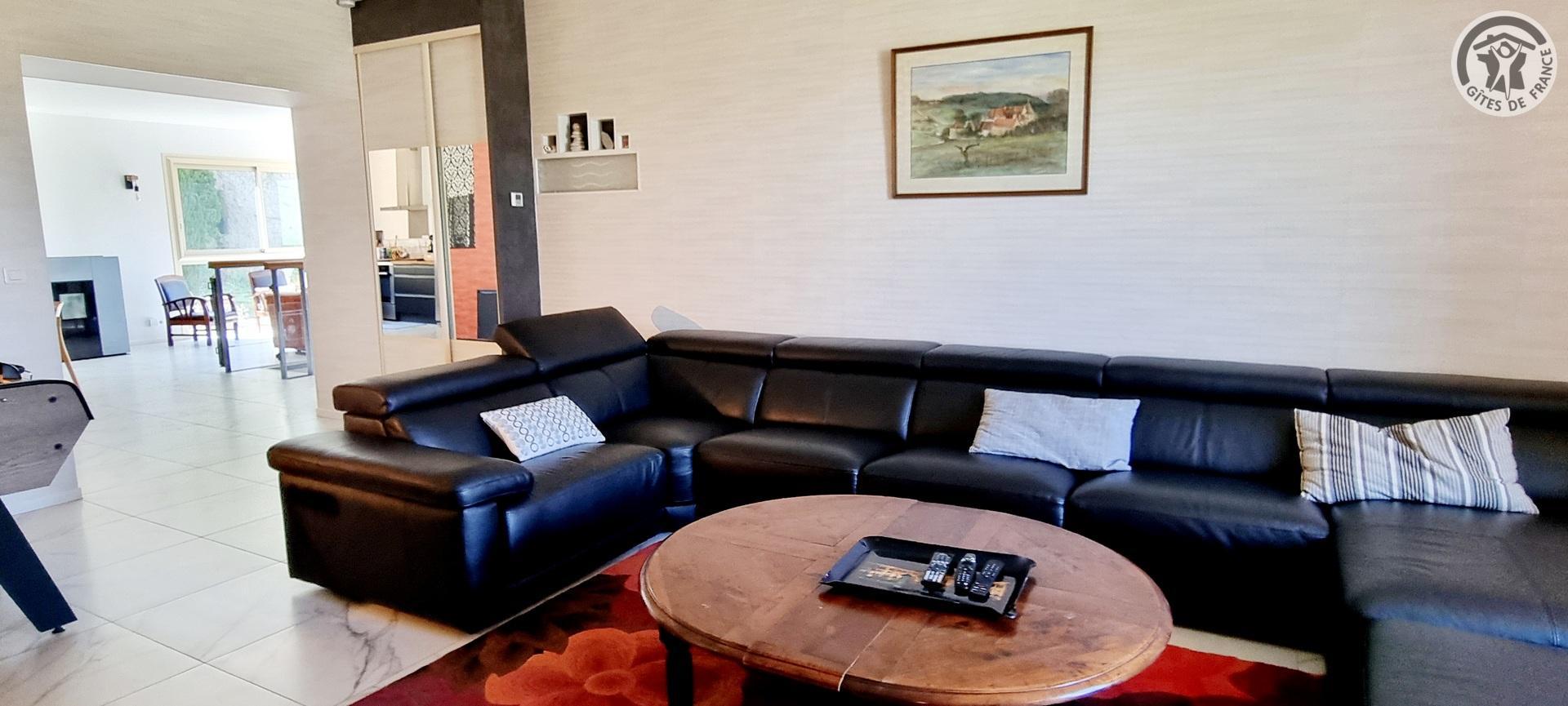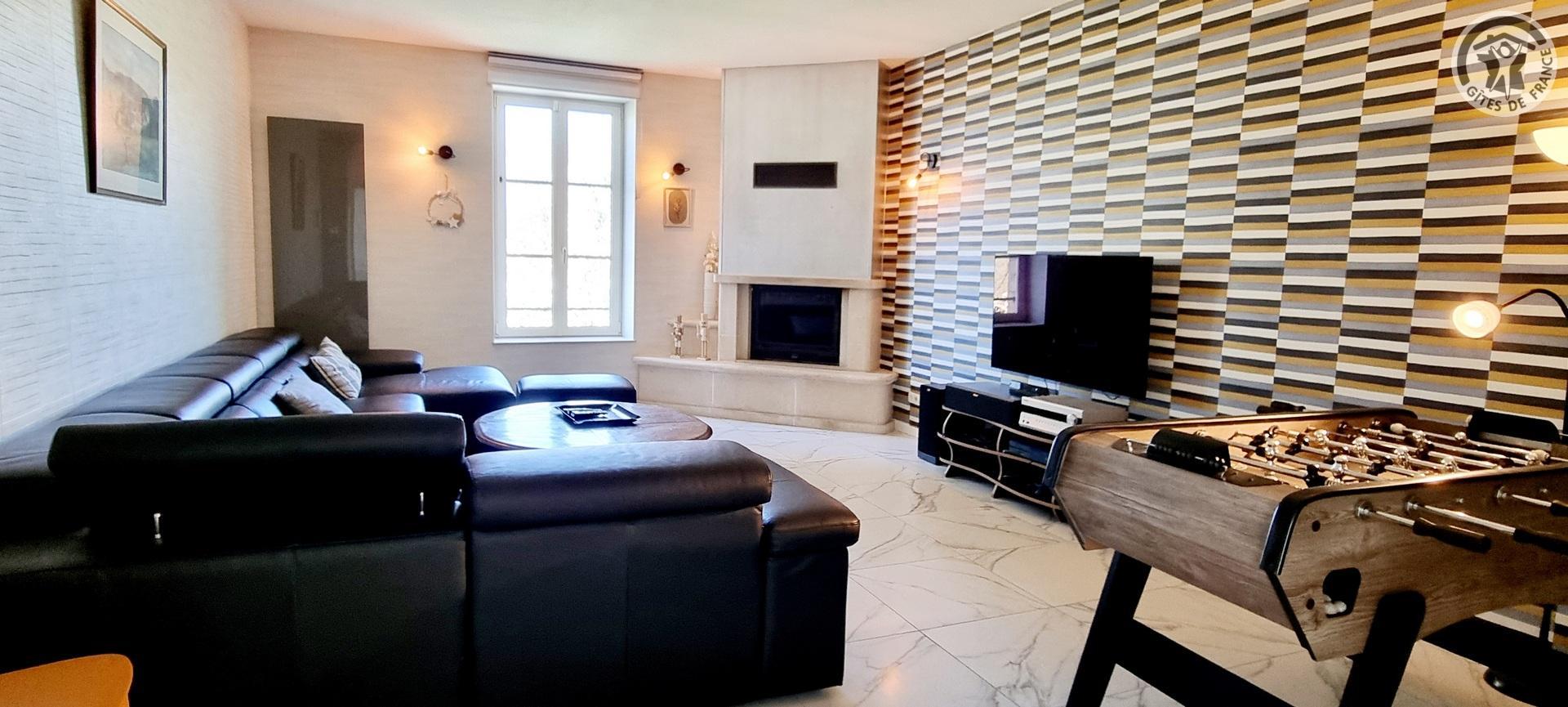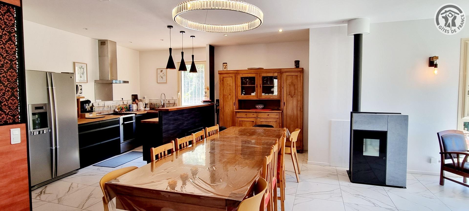 Grand gîte qui comporte : - Au rez-de chaussée : 2 chambres avec chacune un lit double. Une salle d'eau et une salle de bains avec un WC dans chacune. Une salle de jeux avec jeu de fléchettes électronique. - Au premier étage : une cuisine entièrement équipée (plaque de cuisson à induction avec 4 foyers, four, réfrigérateur américain, lave-vaisselle, hotte aspirante, micro-ondes, etc.) ouverte sur une salle à manger conviviale avec poêle à pellets et un petit salon avec vue panoramique sur le jardin. Un grand salon avec TV connectée et baby-foot. Une suite parentale avec un lit double et une douche. Un WC indépendant. - Au second étage : 4 chambres dont deux avec chacune un lit double, une avec un lit simple et une avec 2 lits simples. Un WC indépendant. Profitez d'un jardin clos de 3000m² avec une piscine extérieure couverte et chauffée. Terrasse avec un salon de jardin, un barbecue et une plancha. Le stationnement n'est possible que le long de la route., sur la voie publique.