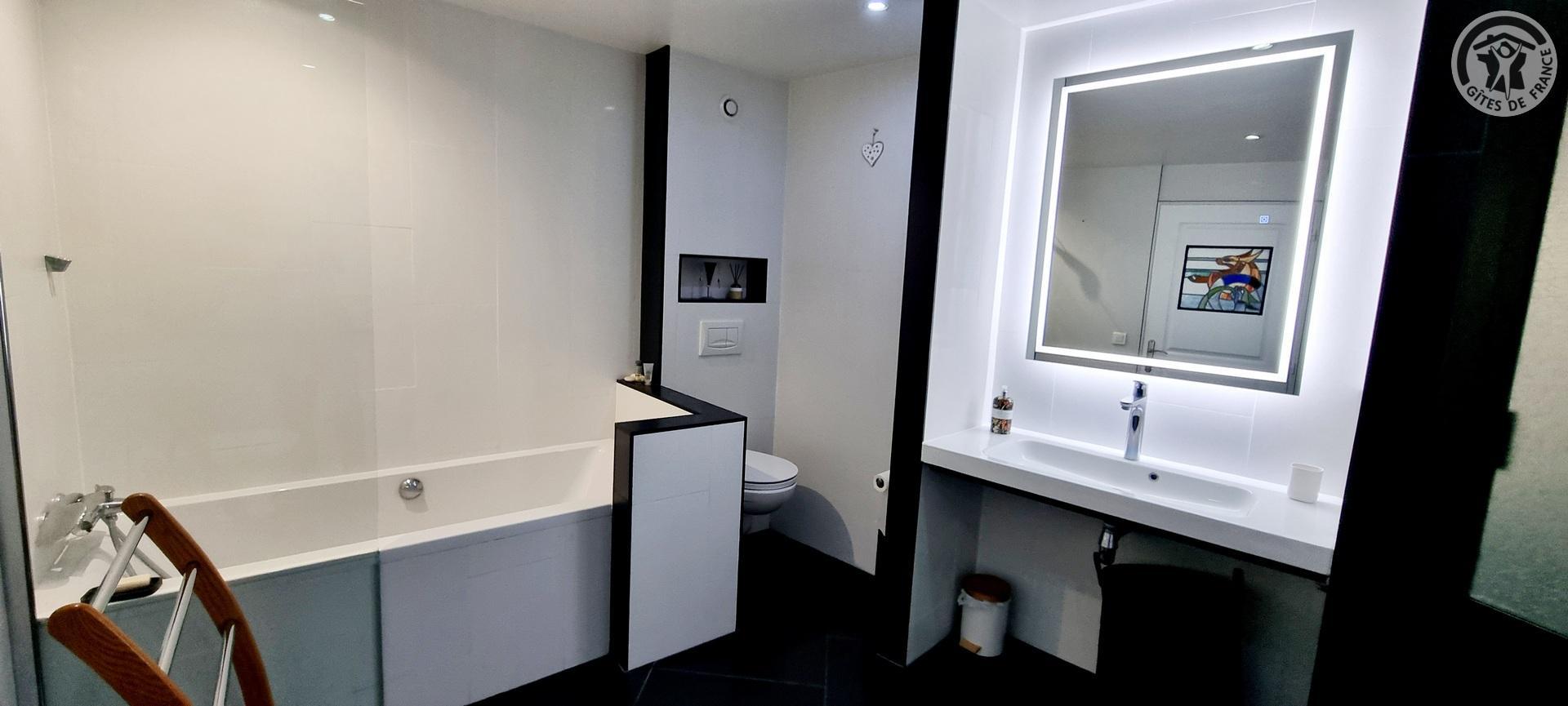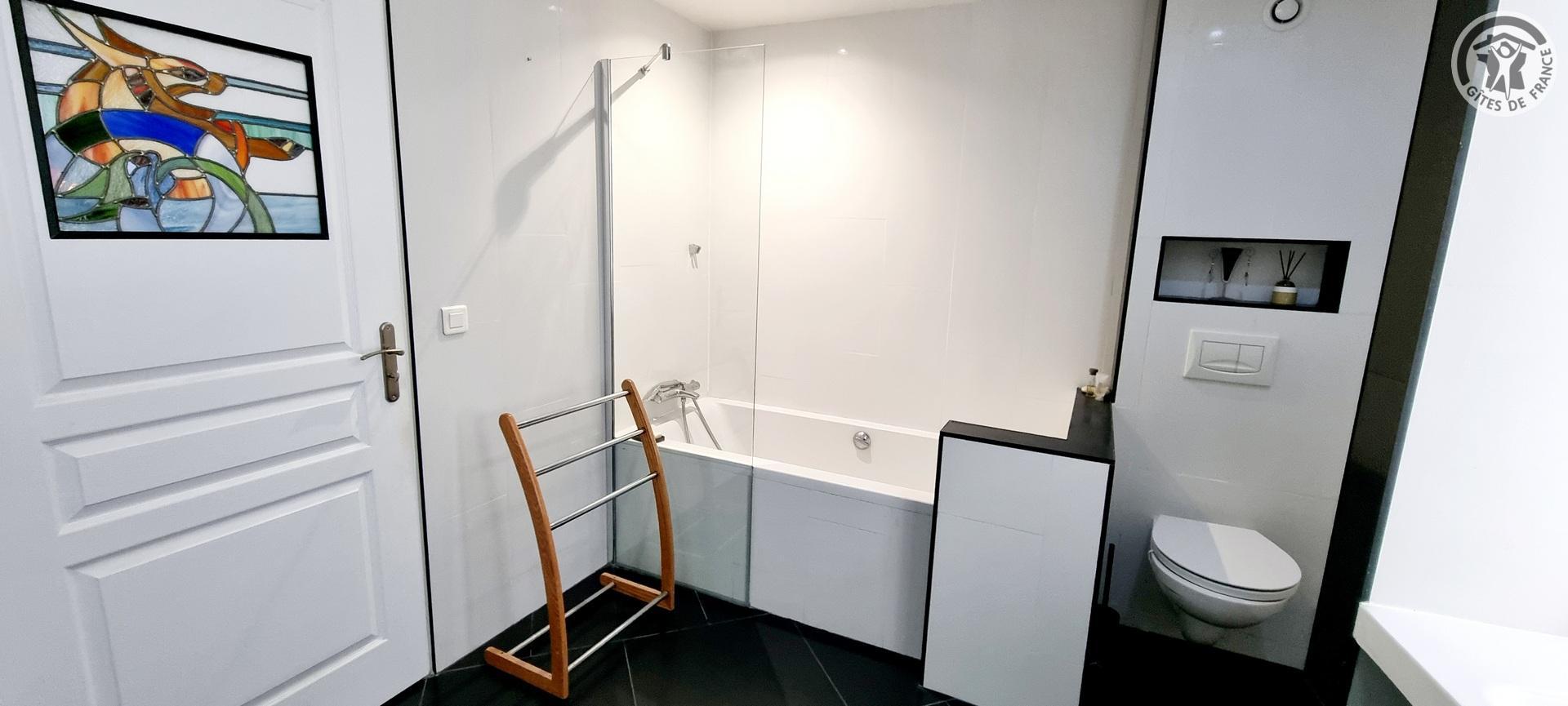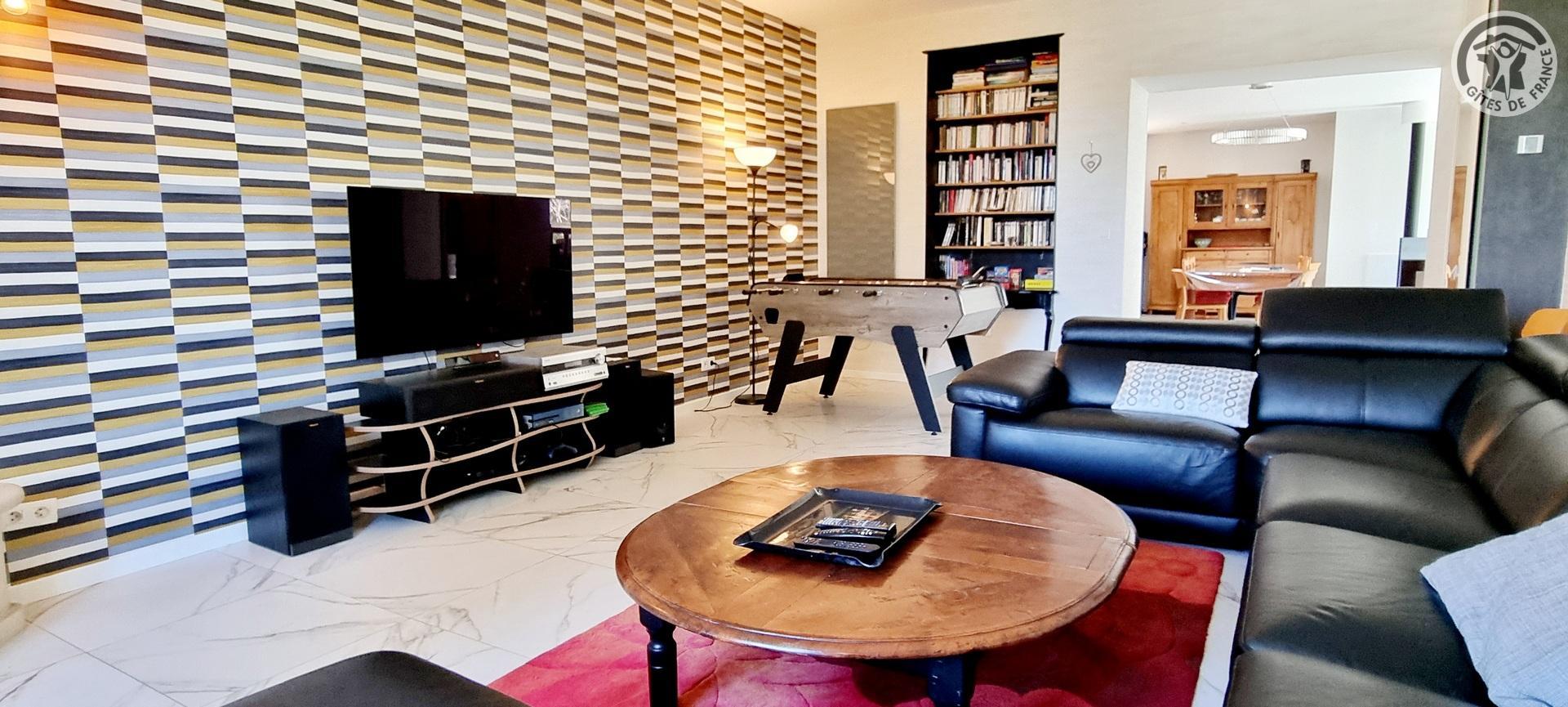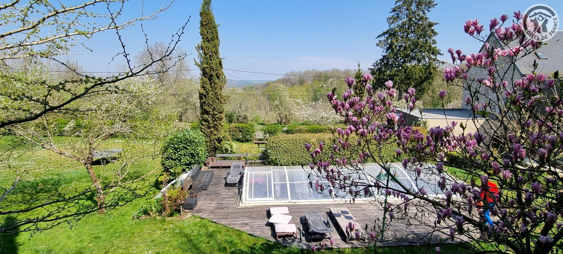Grand gîte qui comporte : - Au rez-de chaussée : 2 chambres avec chacune un lit double. Une salle d'eau et une salle de bains avec un WC dans chacune. Une salle de jeux avec jeu de fléchettes électronique. - Au premier étage : une cuisine entièrement équipée (plaque de cuisson à induction avec 4 foyers, four, réfrigérateur américain, lave-vaisselle, hotte aspirante, micro-ondes, etc.) ouverte sur une salle à manger conviviale avec poêle à pellets et un petit salon avec vue panoramique sur le jardin. Un grand salon avec TV connectée et baby-foot. Une suite parentale avec un lit double et une douche. Un WC indépendant. - Au second étage : 4 chambres dont deux avec chacune un lit double, une avec un lit simple et une avec 2 lits simples. Un WC indépendant. Profitez d'un jardin clos de 3000m² avec une piscine extérieure couverte et chauffée. Terrasse avec un salon de jardin, un barbecue et une plancha. Le stationnement n'est possible que le long de la route., sur la voie publique.